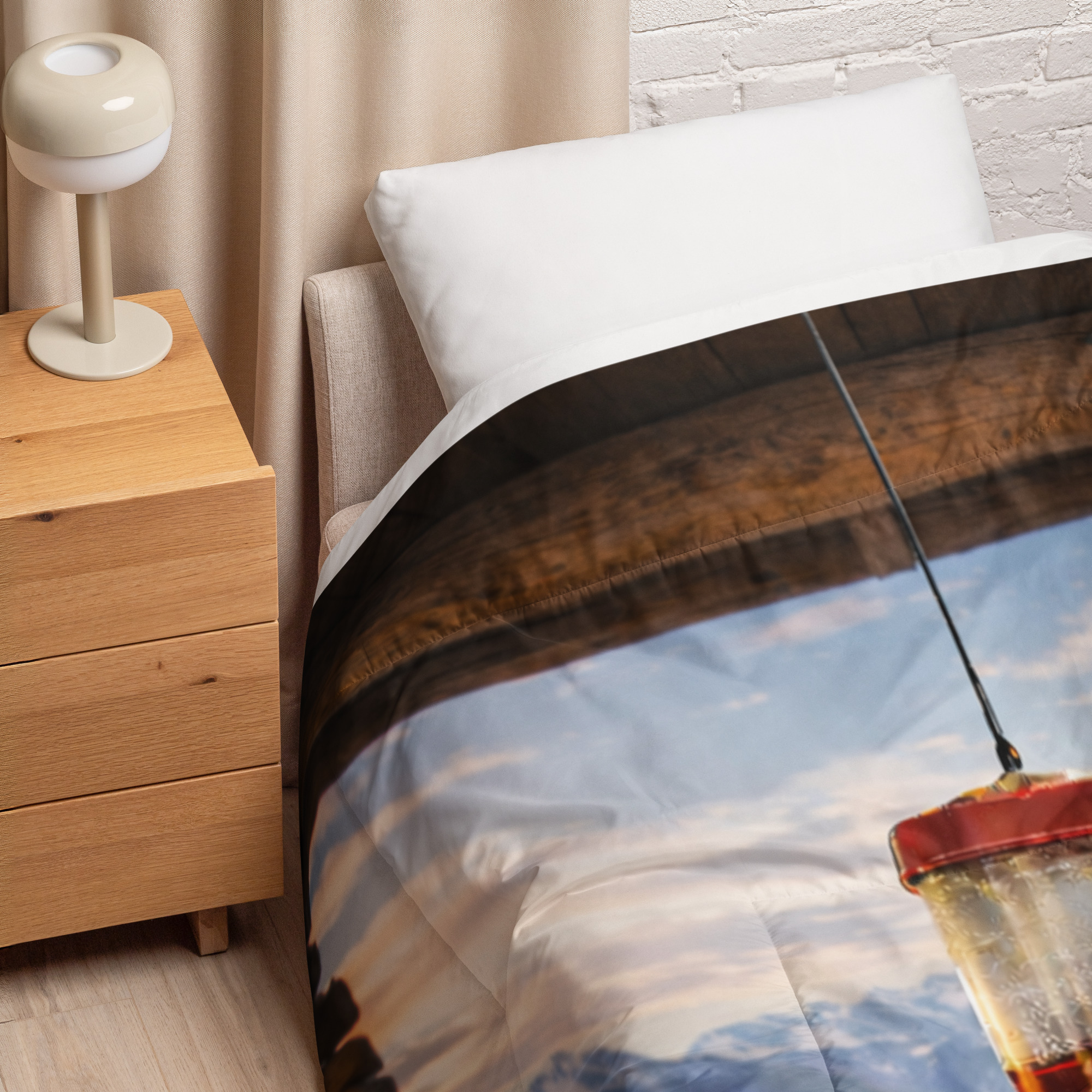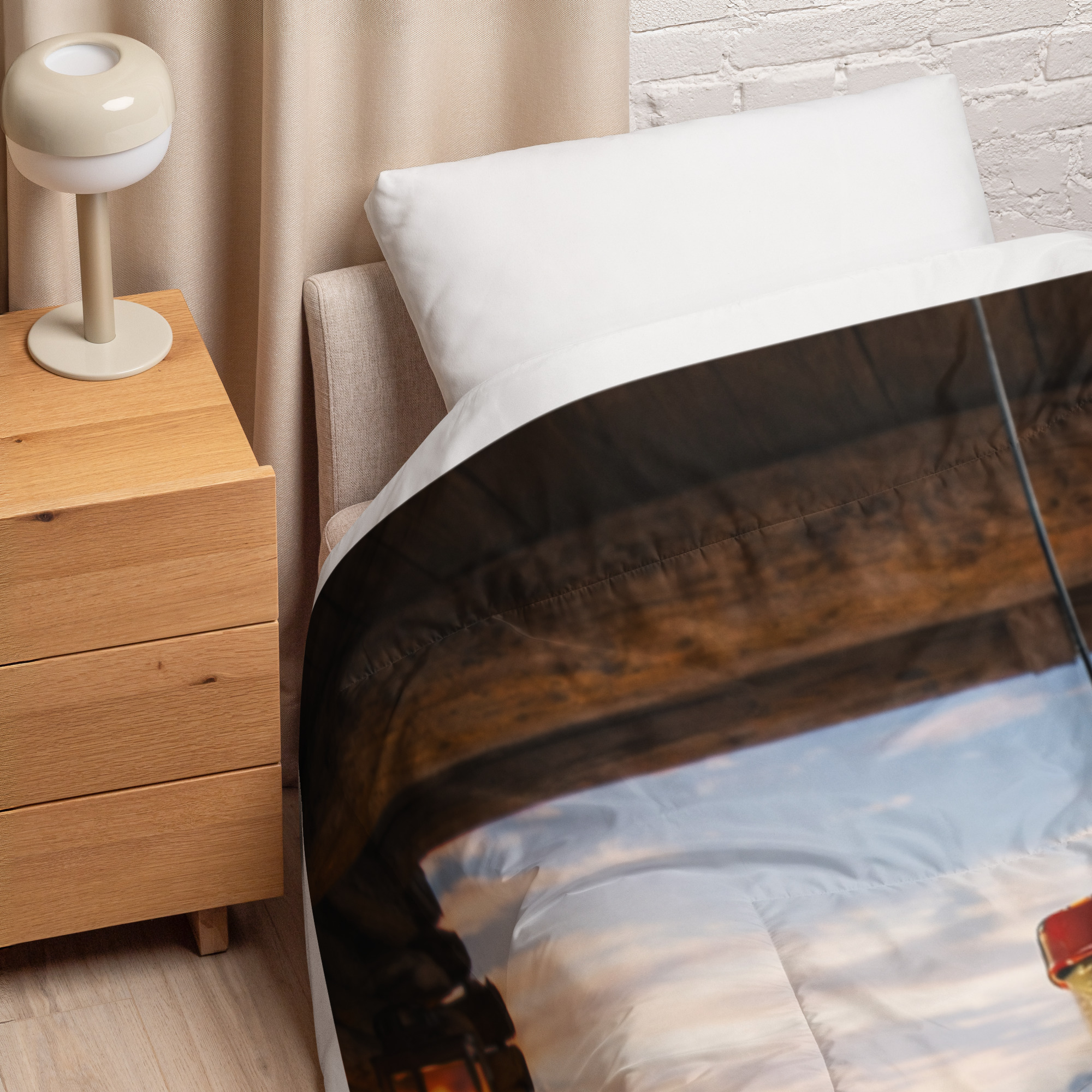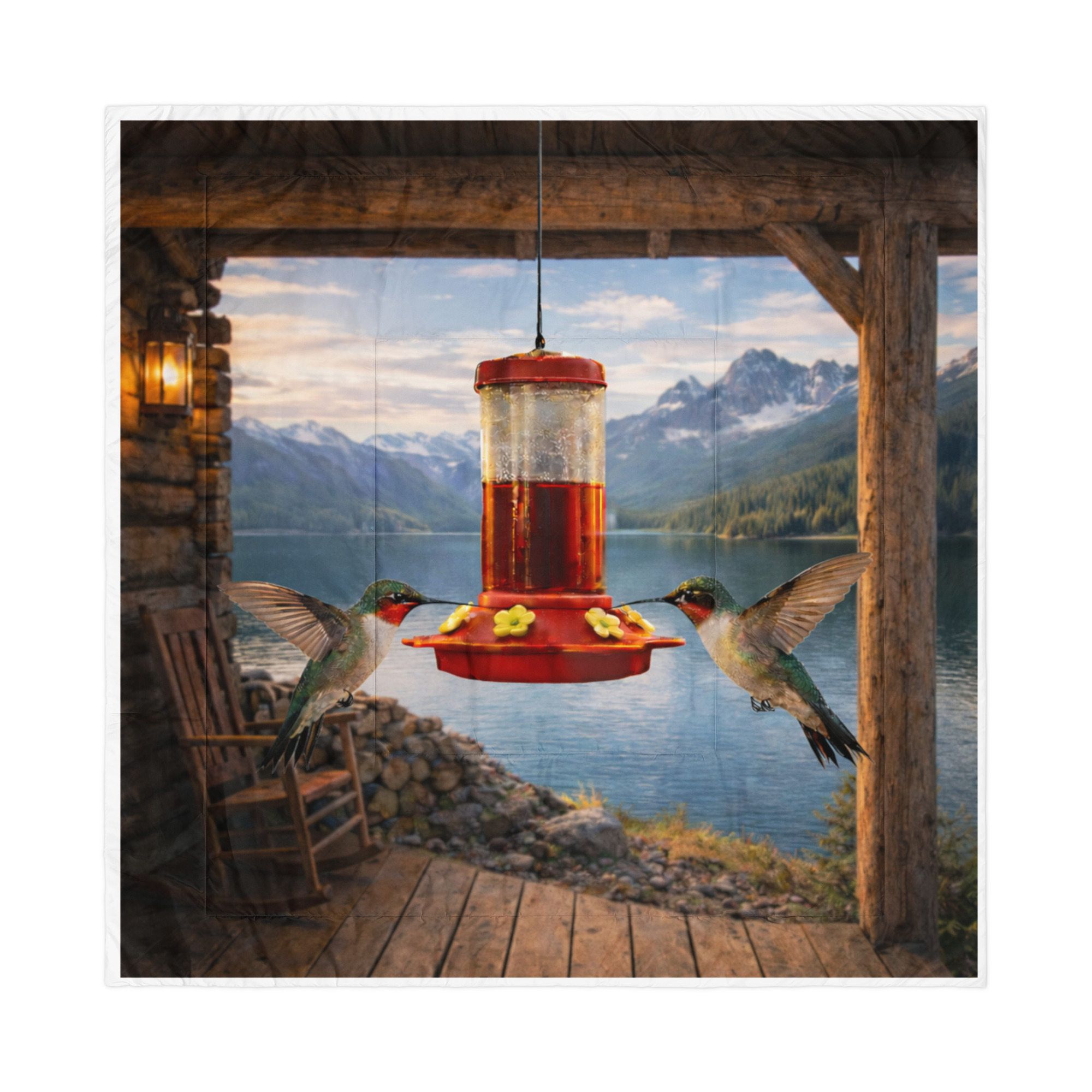 This Keystone Trailhead hummingbird design captures a peaceful lakeside sunset framed by rustic timber beams and warm lantern glow. The rich detail and depth turn your bed into the focal point of the room — perfect for cabins, lodge-style homes, or anyone who wants the outdoors woven into their space.