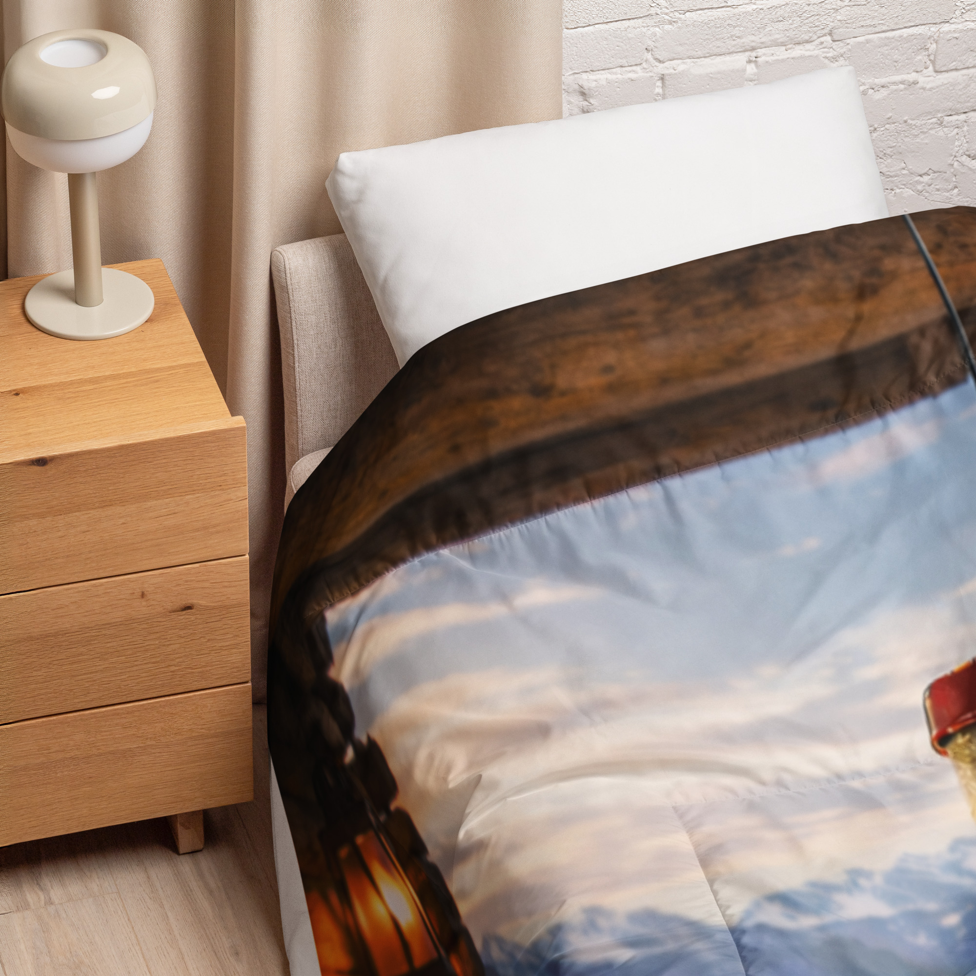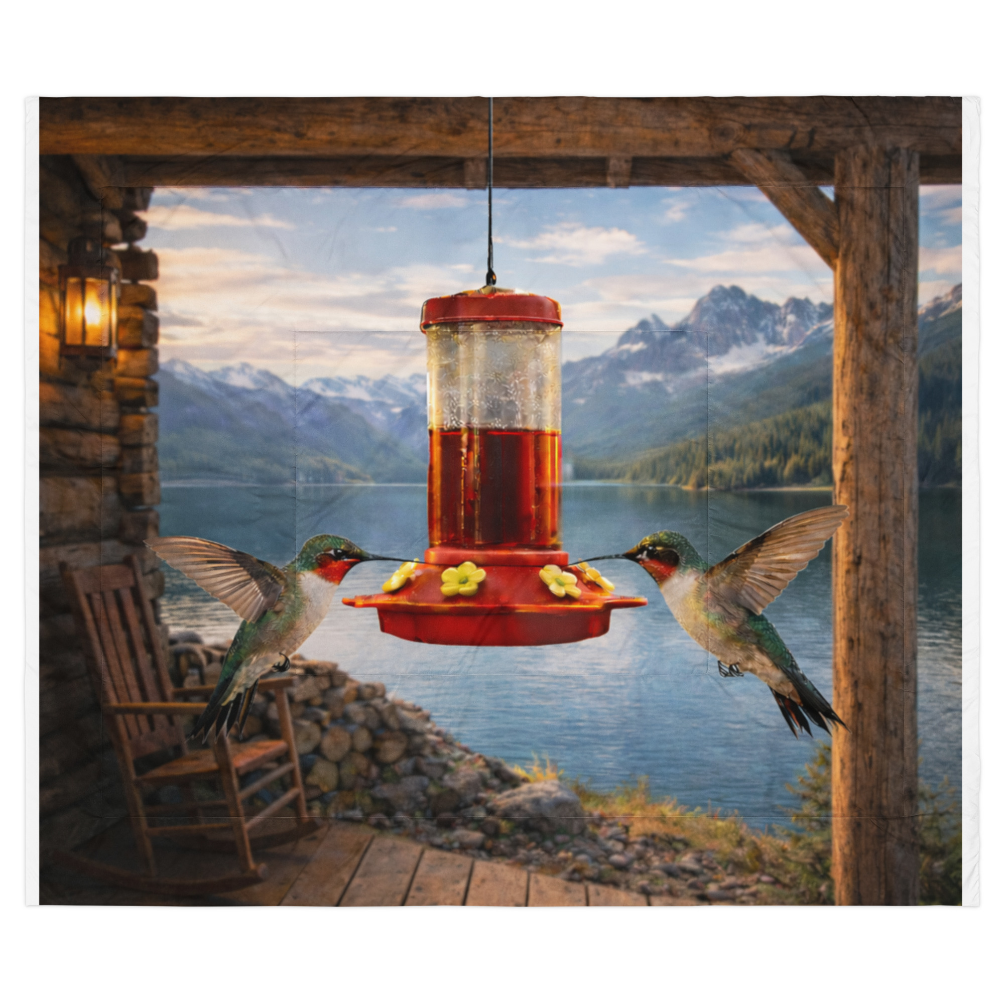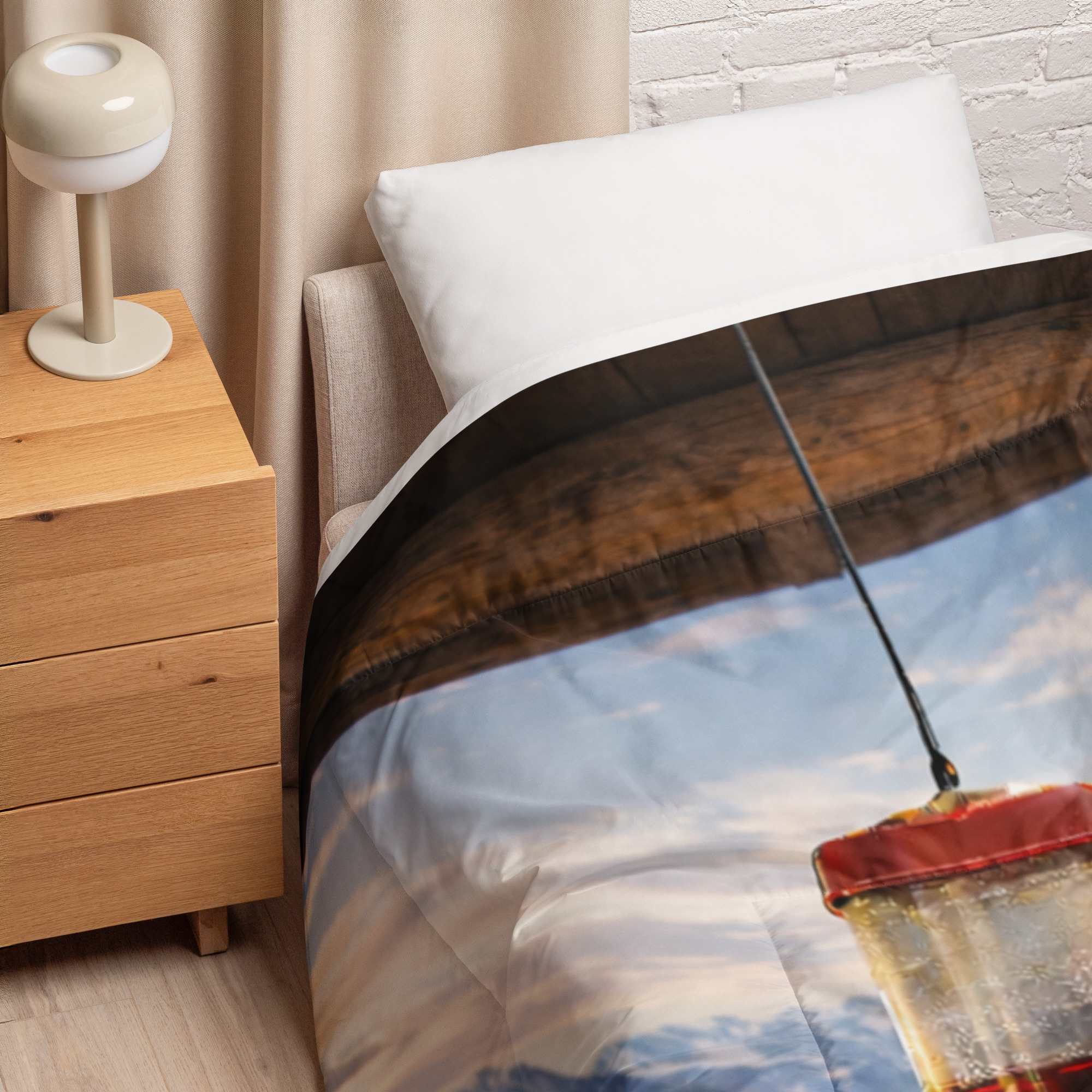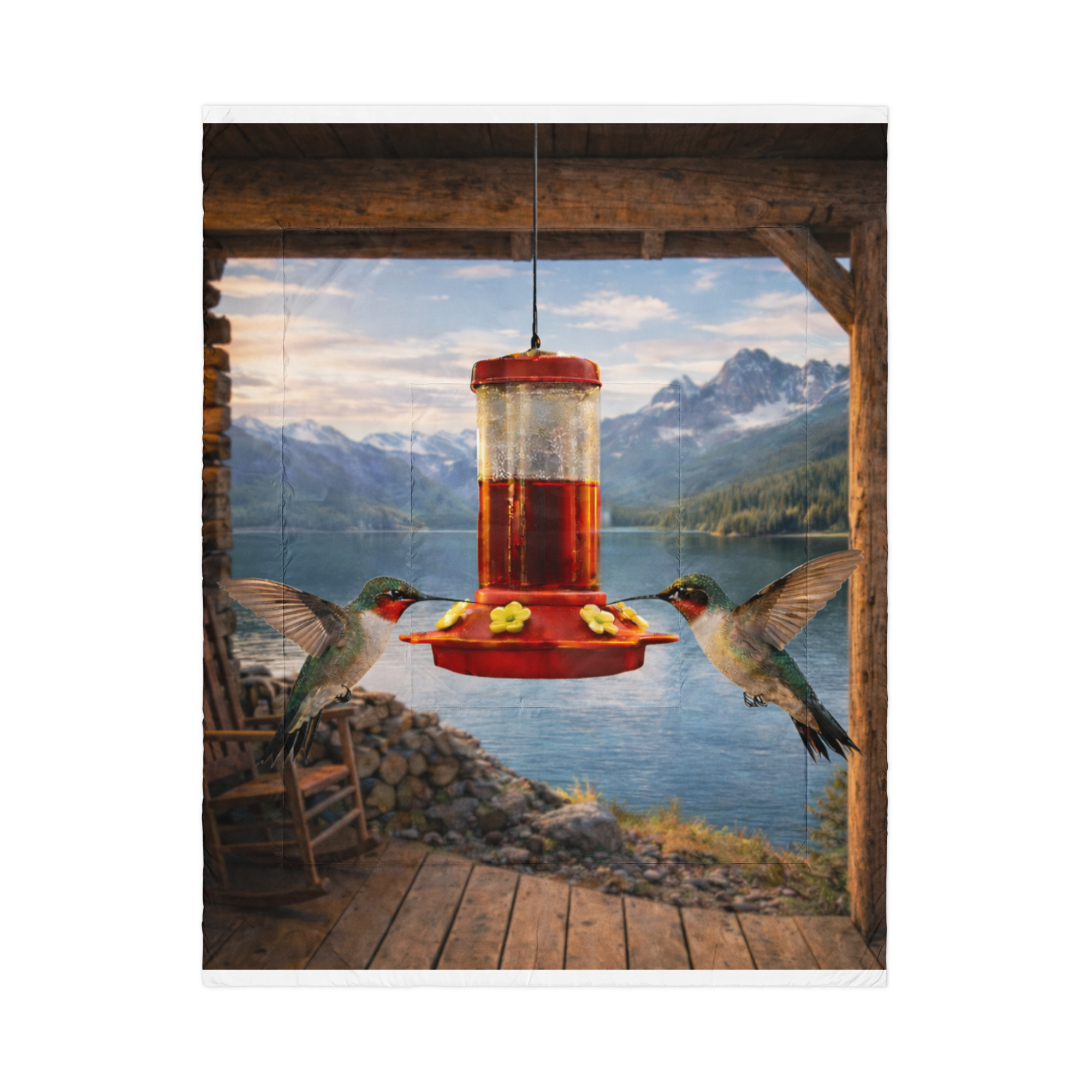 This Keystone Trailhead hummingbird design captures a peaceful lakeside sunset framed by rustic timber beams and warm lantern glow. The rich detail and depth turn your bed into the focal point of the room — perfect for cabins, lodge-style homes, or anyone who wants the outdoors woven into their space.