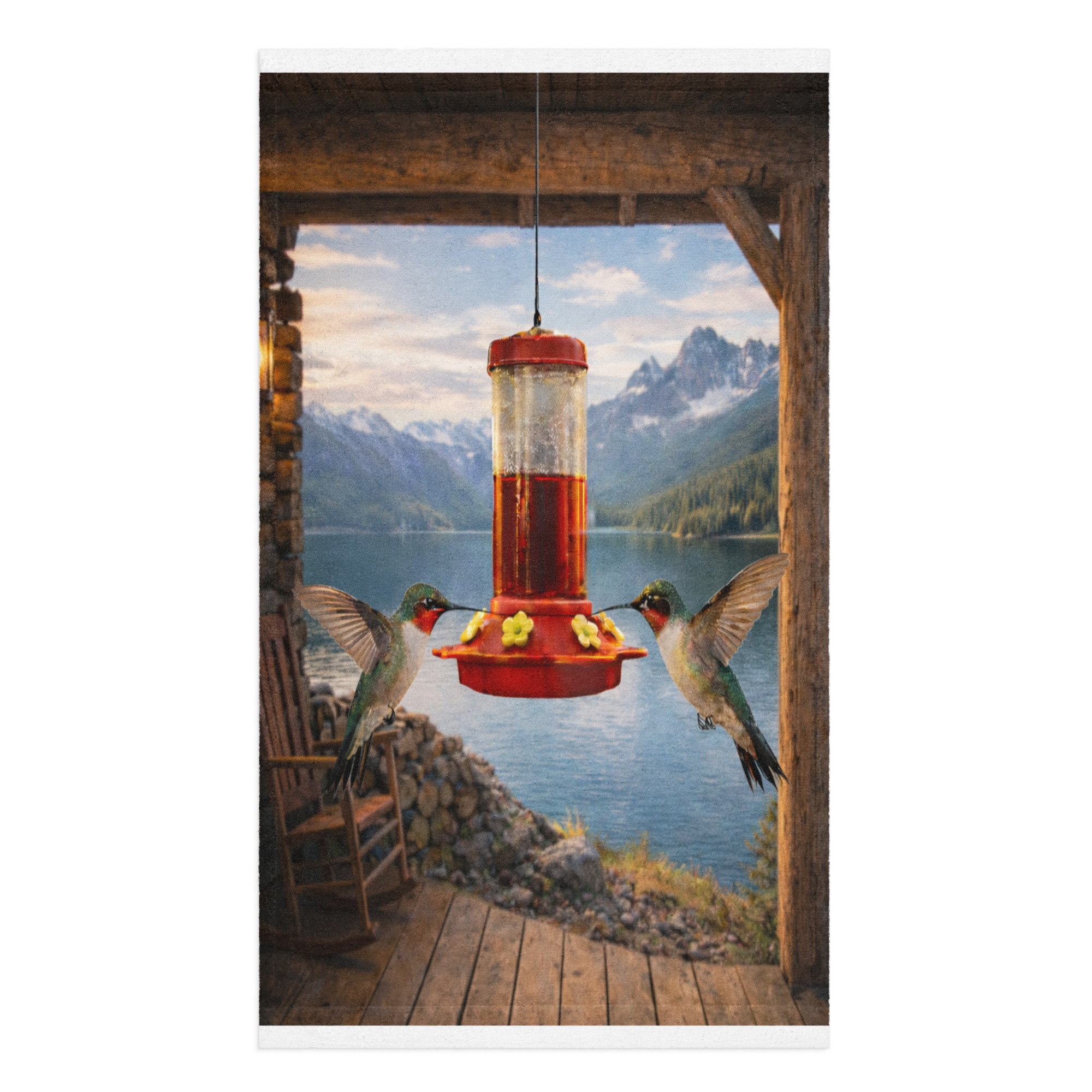 This Keystone Trailhead hummingbird mountain design captures a peaceful lakeside scene framed by rustic timber beams and warm lantern light. The natural tones and depth bring quiet character to your bathroom, guest space, or cabin retreat.