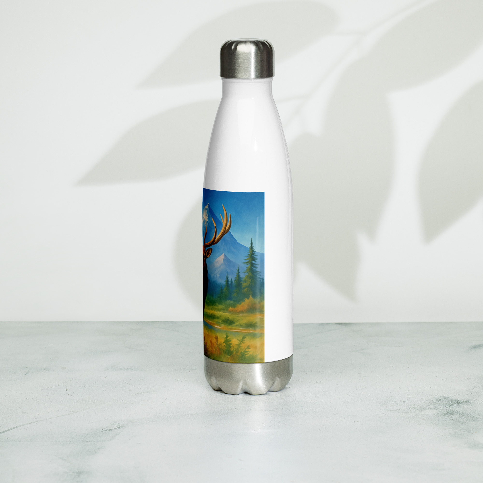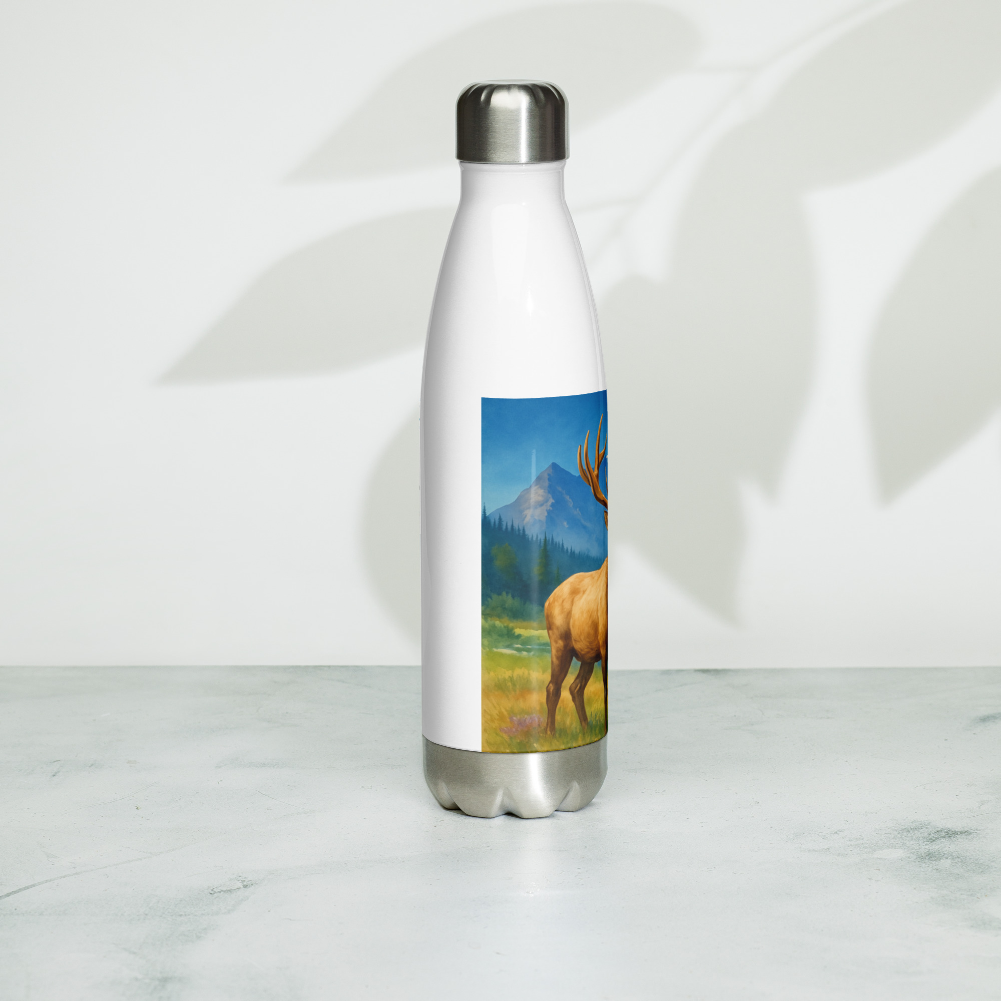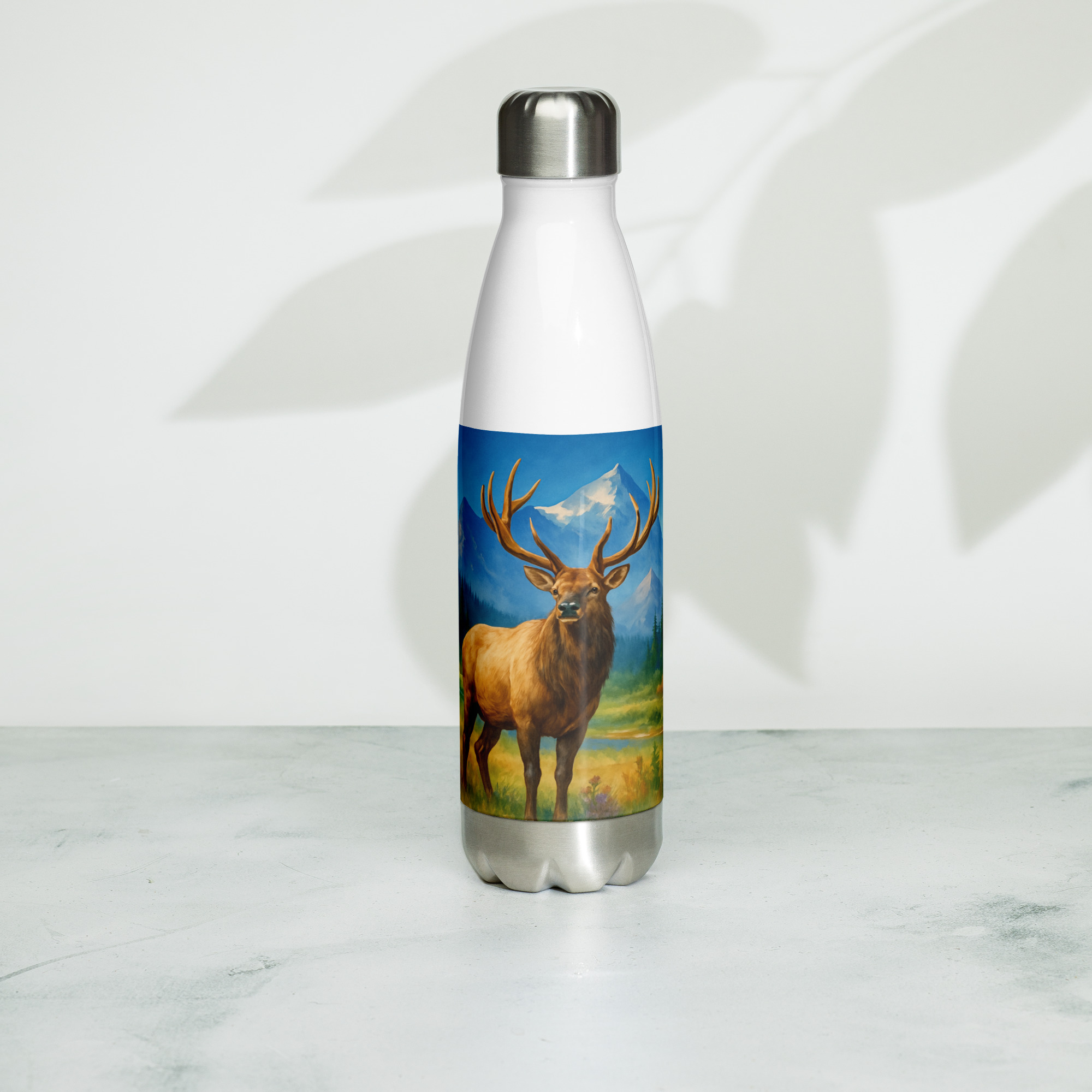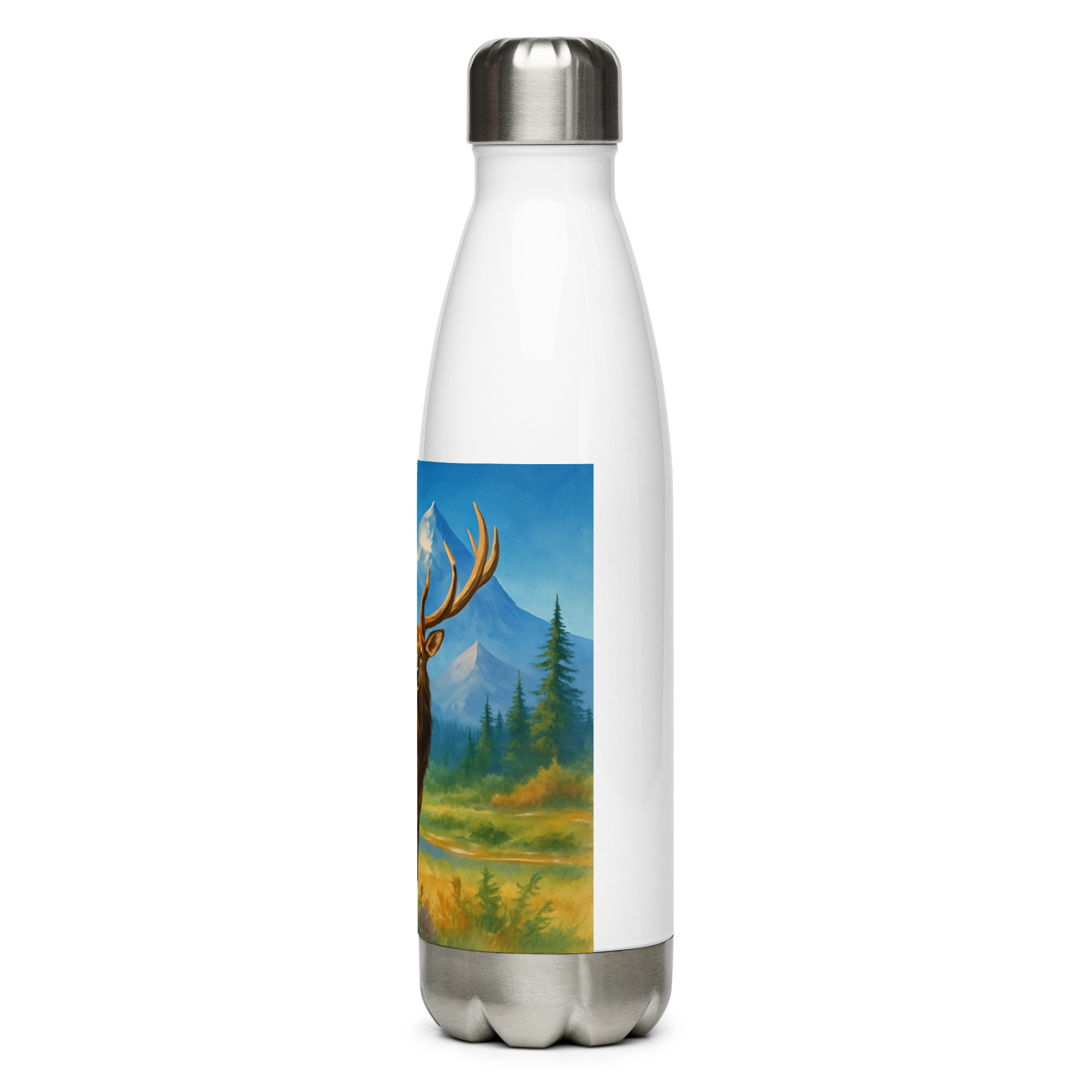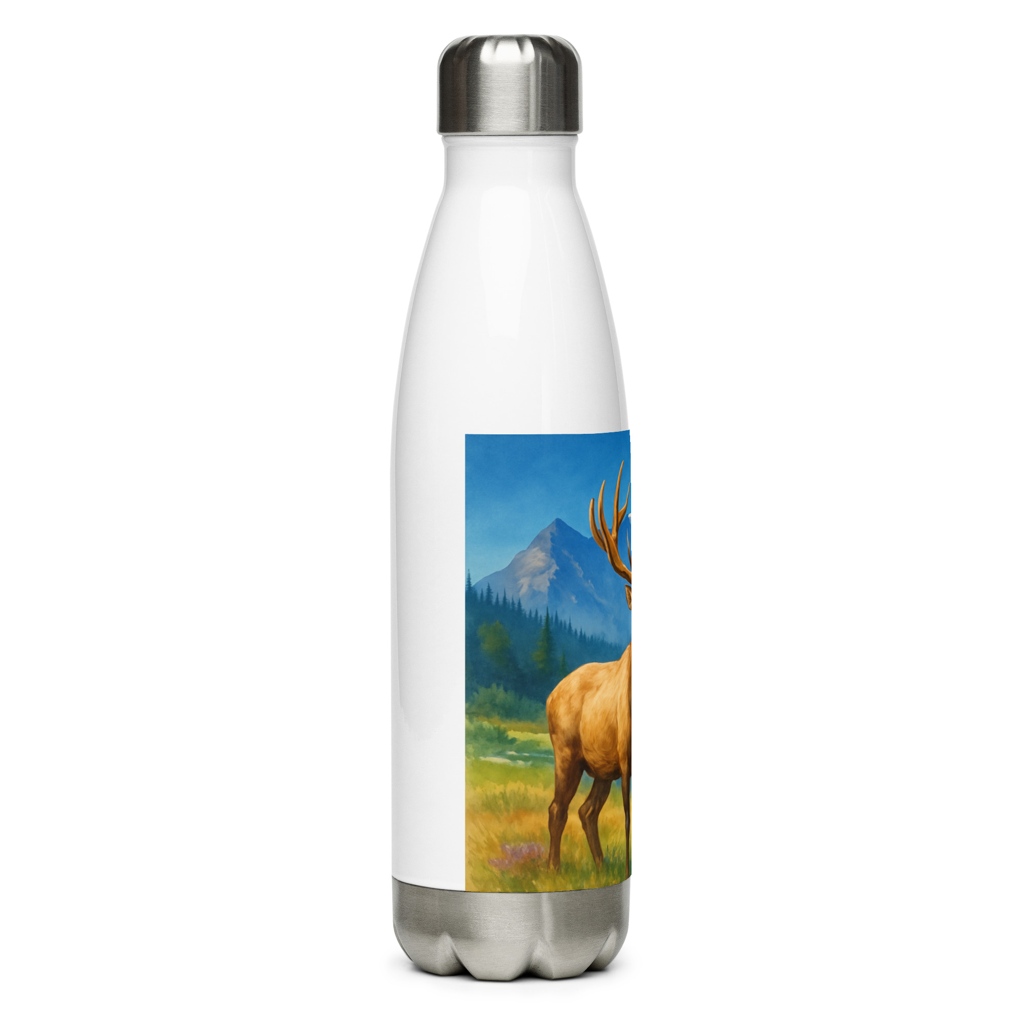 This Majestic Elk Stainless Steel Water Bottle features our signature wilderness elk artwork set against towering mountains and open sky — built for those who’d rather be outside.